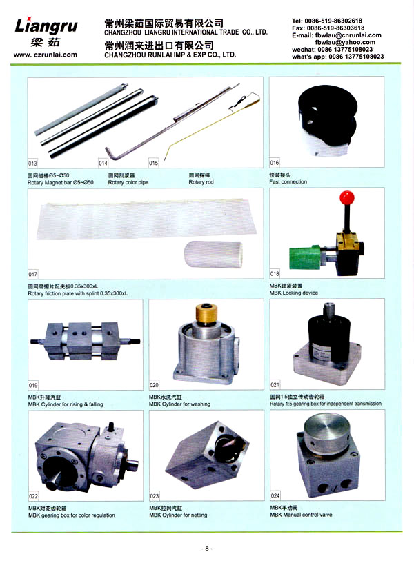 常州梁茹國際貿(mào)易有限公司是國內(nèi)外雙用鋏,T型刮漿片,感光膠, 640軸承,剝邊器,阿托斯滑塊,印花用漿泵,針板座, 印花用圓網(wǎng),印花圓筒網(wǎng),華磁棒,針板,毛刷輪,定型機(jī)鏈條, 切布刀片的主要供應(yīng)商 。我們公司位于常州市,臨近上海,交通十分便利。 我們注重產(chǎn)品質(zhì)量,價格優(yōu)惠,這是我們成功的原因所在,我司跟配套廠家緊密合作,不斷推出新產(chǎn)品,年銷售額逐年增加。我們的產(chǎn)品涉及化工、機(jī)械、紡織印染機(jī)械配件。我們熱忱歡迎國內(nèi)外客戶與我司洽談業(yè)務(wù),相信在我們的熱情服務(wù)之下能合作成功!