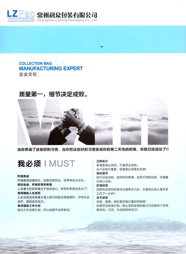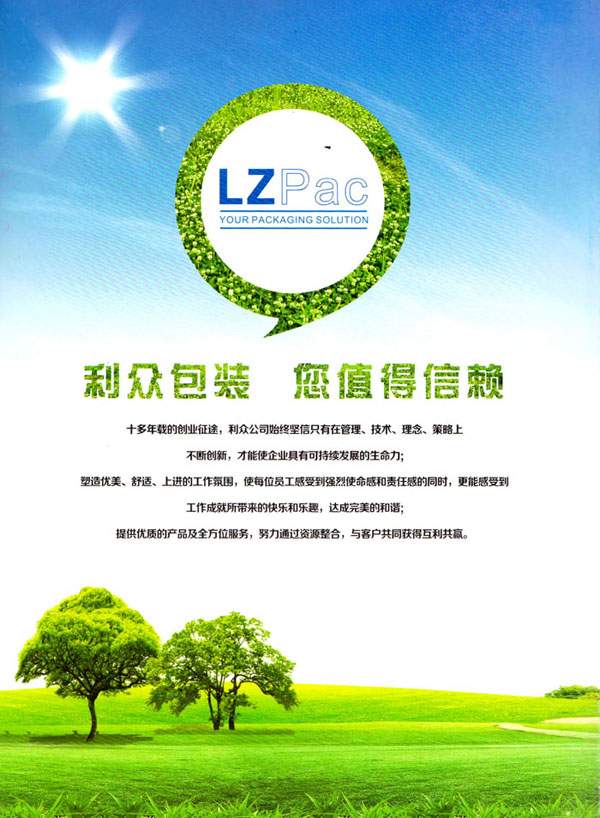 擁有強大的質(zhì)量管理系統(tǒng)。公司成立初期就通過了ISO9001的體系論證。公司奉行“質(zhì)量第一,客戶至上”的經(jīng)營理念,始終堅持以質(zhì)量謀發(fā)展的原則,執(zhí)著追求以新工藝,新設(shè)備,高效率不斷優(yōu)化生產(chǎn)流程,降低生產(chǎn)成本以適應(yīng)市場。常州利眾包裝有限公司地處美麗的江南水鄉(xiāng)——常州。地理位置十分優(yōu)越。