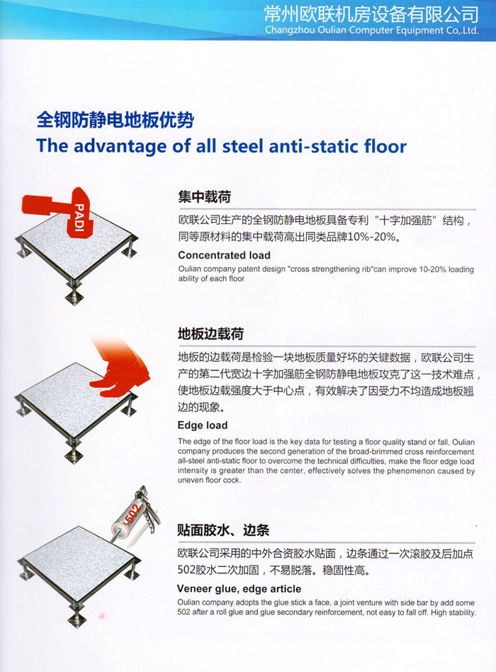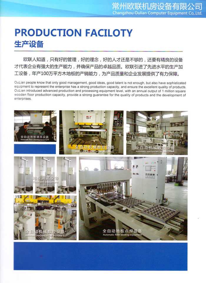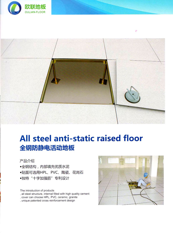 防靜電高架活動(dòng)地板、全鋼地板、陶瓷地板是計(jì)算機(jī)行業(yè)發(fā)展起來(lái)的新型鋪地材料,隔離了潮氣、靜電灰塵,最重要的是解決了綜合布線問(wèn)題,無(wú)需預(yù)埋管線,可隨時(shí)拆卸、搬移,保證了資訊設(shè)備完整的優(yōu)點(diǎn),適應(yīng)了智能化樓宇中信息自動(dòng)化技術(shù)對(duì)所處環(huán)境的特定要求,避免了廣大客戶的雙重投資,使現(xiàn)代化辦公程度更加高效,辦公場(chǎng)所更加舒適。 “歐聯(lián)”系列全鋼地板,符合國(guó)家安全要求,種類完備多樣,其中防靜電陶瓷地板、硫酸鈣地板等除具有普通瓷質(zhì)的裝飾和實(shí)用性外,其耐磨、防水、防火功能優(yōu)于其它同類產(chǎn)品,防靜電系列地板,能切合不同客戶的要求,其靈活的配置,深受客戶歡迎,不同材質(zhì)的地板結(jié)構(gòu)使設(shè)計(jì)師的設(shè)計(jì)空間比傳統(tǒng)的更加廣闊自由和善變。 公司大力發(fā)展國(guó)內(nèi)外銷售業(yè)務(wù),多次中標(biāo)國(guó)內(nèi)重點(diǎn)工程 ,例:哈爾濱醫(yī)科大學(xué)、山東大學(xué)、上海普通機(jī)場(chǎng)等。 公司將一如既往開發(fā)和制造一流的產(chǎn)品,愿與廣大有識(shí)之士合作發(fā)展,共創(chuàng)美好未來(lái)。