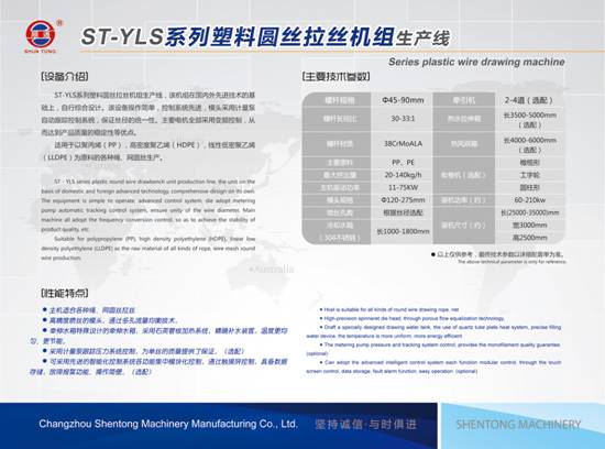 常州神通機(jī)械制造有限公司位于滆湖之盼,依托常州市武進(jìn)區(qū)優(yōu)越的地理環(huán)境,公司創(chuàng)建于1992年,是專(zhuān)業(yè)生產(chǎn)塑料機(jī)械拉絲機(jī)成套設(shè)備的企業(yè)。 神通公司經(jīng)過(guò)30年多來(lái)的艱辛創(chuàng)業(yè),在塑料機(jī)械行業(yè)中積累了豐富的經(jīng)驗(yàn),為擴(kuò)大生產(chǎn)能力,提升產(chǎn)品質(zhì)量,新組建了一個(gè)技術(shù)緊密合作型企業(yè),并具有獨(dú)立法人資質(zhì),即為宜興順通機(jī)械制造有限公司。我們會(huì)一如既往地努力,堅(jiān)持走“順通”的品牌之路,愿與各位同行攜手共創(chuàng)未來(lái),為塑料機(jī)械行業(yè)的發(fā)展作出貢獻(xiàn)。 神通公司擁有標(biāo)準(zhǔn)廠(chǎng)房共計(jì)15000m²,現(xiàn)有先進(jìn)的三軸、四軸聯(lián)動(dòng)的加工中心,數(shù)控鉆床、銑床、車(chē)床、外圓磨床、剪板機(jī)、折彎?rùn)C(jī)等高精度加工設(shè)備。 神通公司以精湛的生產(chǎn)工藝、完善的管理體系和滿(mǎn)意的售后服務(wù),得到新老用戶(hù)的信賴(lài)。設(shè)備外形美觀(guān)、結(jié)構(gòu)合理、性能安全可靠、具有先進(jìn)的控制系統(tǒng)等優(yōu)點(diǎn),物美價(jià)優(yōu),得到新老用戶(hù)的一致好評(píng)。 神通公司對(duì)產(chǎn)品質(zhì)量要求是:從原材料采購(gòu)到成品出廠(chǎng),均執(zhí)行品質(zhì)控制。 神通公司堅(jiān)持“以人為本、誠(chéng)信經(jīng)營(yíng)、科技興業(yè)、精益求精、以質(zhì)取勝、合作共贏”的經(jīng)營(yíng)理念!耙再|(zhì)量求生存,以創(chuàng)新求發(fā)展”的企業(yè)精神。 主營(yíng)業(yè)務(wù): 1.雙色人造草坪?jiǎn)谓z、雙色人造草坪曲絲一步法、人造草坪開(kāi)網(wǎng)絲拉絲成套生產(chǎn)線(xiàn)設(shè)備系列,及草坪絲一步法捆綁收卷機(jī)、一步法捻線(xiàn)機(jī)、絡(luò)筒機(jī)。 2.PE、 PP、 PA、PET圓絲、工業(yè)單絲等拉絲成套生產(chǎn)線(xiàn)設(shè)備系列。 3.集裝袋、編織袋、土工布、PP基布、遮陽(yáng)網(wǎng)、捆草網(wǎng)、蓋土網(wǎng)等平膜扁絲拉絲機(jī)成套生產(chǎn)線(xiàn)設(shè)備系列。 4.電纜填充網(wǎng)狀絲、PP縱向拉伸膜、PE壓花膜成套生產(chǎn)線(xiàn)設(shè)備系列,及各種特殊規(guī)格的電纜填充繩收卷機(jī)等電纜材料輔助設(shè)備5.高低壓PP,PE吹膜機(jī)及撕裂膜、捆扎帶生產(chǎn)線(xiàn)設(shè)備系列。 6.塑料回收造粒機(jī)組、邊絲回收裝置及粉碎機(jī)等。 7.圈、扁絲磁性收卷機(jī)、變頻無(wú)刷電機(jī)收卷機(jī),圓絲工字盤(pán)、橄欖形、寶塔形收卷機(jī)及浸膠線(xiàn)專(zhuān)用收卷機(jī)。 8.舊塑料拉絲機(jī)設(shè)備改造、可定做特殊規(guī)格的圓、扁絲帶捻度專(zhuān)用收卷機(jī)、繩網(wǎng)絡(luò)筒機(jī)及其它收卷機(jī)。