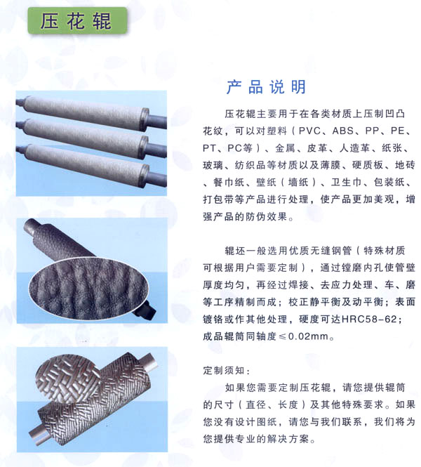 常州市武進(jìn)區(qū)禮嘉鎮(zhèn)萬(wàn)超機(jī)械有限公司專業(yè)生產(chǎn)、加工花輥、鏡面輥、無(wú)紡布設(shè)備,及各類機(jī)械配件。產(chǎn)品廣泛應(yīng)用于金屬、塑料、皮革、紙張、玻璃、木材、無(wú)紡布、衛(wèi)生材料、包裝裝潢等行業(yè)。 公司經(jīng)營(yíng)方針:服務(wù)鍥而不舍 品質(zhì)力臻卓越。得到國(guó)內(nèi)眾多客戶的厚愛(ài)與好評(píng)。 歡迎各界朋友蒞臨常州萬(wàn)超機(jī)械有限公司指導(dǎo)和業(yè)務(wù)洽談。 萬(wàn)超為顧客免費(fèi)打樣、并代客壓紋!