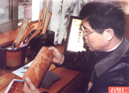 白堅仁,1956年生于江蘇常州,國家級非物質(zhì)文化遺產(chǎn)、江蘇省級傳承人、江蘇省名人,高級工藝美術(shù)師,是留青竹刻泰斗白士風之子。從小深受先父的熏陶和指點,寒來署往、夜以繼日,不僅學到了先父厚樸豁達的品格,更深得先父竹刻藝術(shù)的真諦。除繼承刻有先父創(chuàng)立的橫臺屏、筆筒等作品外,更注重作品的創(chuàng)新。多年來,經(jīng)過艱辛的探索和反復的實踐,努力吸取姐妹藝術(shù),成功地采用了多片拼裝,配上紅木框架,制成大型的圖文并貌的作品,如帽籠、大插屏、鏡框掛件、四條屏、甚至中堂。在構(gòu)圖內(nèi)容、技法變化、裝幀形式等方面,都走出了創(chuàng)新之路,使所制作品適應(yīng)了現(xiàn)代人們的審美情趣和生活需求,實現(xiàn)了多年來要使留青竹刻與書畫作品同樣也能懸掛于廳堂之上的愿望。作品多次在國內(nèi)、國際展覽中獲獎,并獲得了留青竹刻史上的首位二項國家專利擁有者。