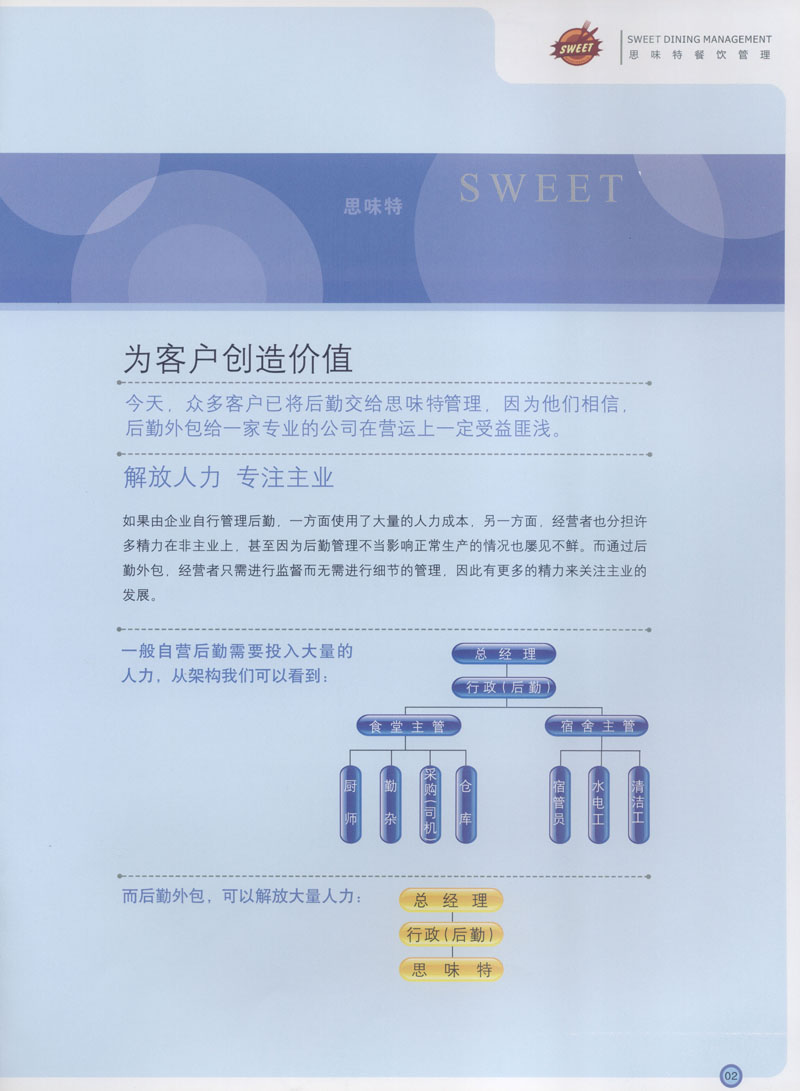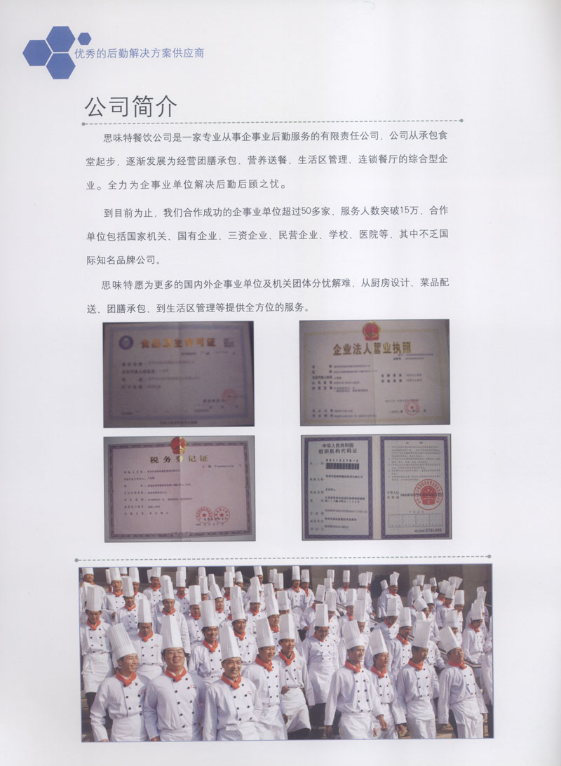 常州市思味特餐飲有限公司是一家專業(yè)從事企事業(yè)后勤服務(wù)的有限責(zé)任公司,公司從承包食堂起步,逐漸發(fā)展為經(jīng)營團膳承包、營養(yǎng)送餐、生活區(qū)管理、連鎖餐廳的綜合型企業(yè)。2008年公司斥資100萬元,在常州興建了可以同時提供3000餐膳食的中央廚房,重點打造“和美客”后勤服務(wù)品牌,全力為企事業(yè)單位解決后勤后顧之憂。 到目前為止,我們合作成功的企事業(yè)單位超過50多家,服務(wù)人數(shù)突破15萬,合作單位包括國家機關(guān)、國有企業(yè)、三資企業(yè)、民營企業(yè)、學(xué)校、醫(yī)院等,其中不乏國際知名品牌公司。 和美客愿為更多的國內(nèi)外企事業(yè)單位及機關(guān)團體分憂解難,從廚房設(shè)計、菜品配送、團膳承包、到生活區(qū)管理等提供全方位的服務(wù)。