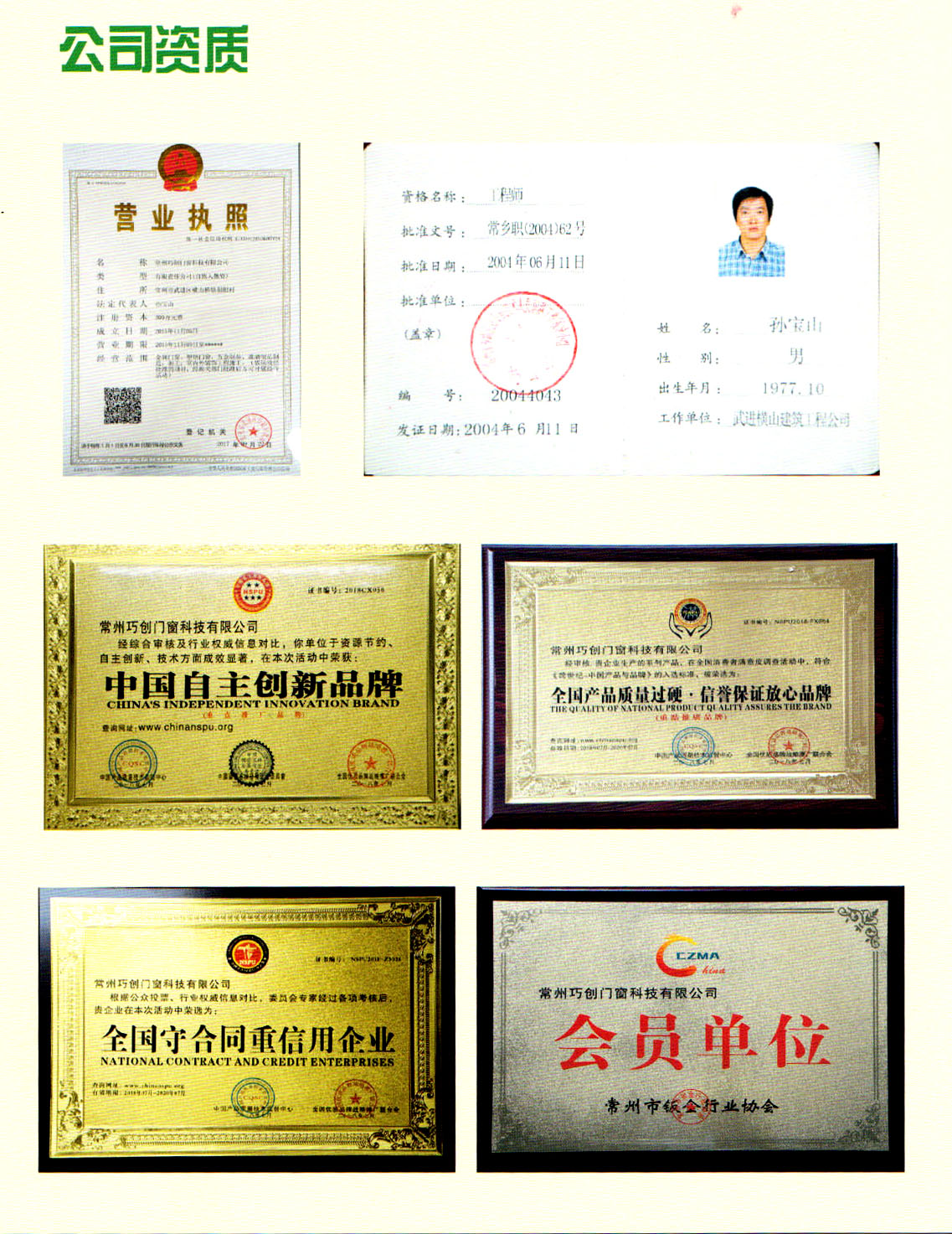 常州巧創(chuàng)門窗科技有限公司成立于1995年,坐落于江蘇省常州市橫山橋鎮(zhèn)朝陽經(jīng)濟(jì)開發(fā)區(qū)。公司占地面積18000平米,現(xiàn)有員工180人。是一個(gè)集設(shè)計(jì)、生產(chǎn)、加工、安裝、經(jīng)營與一體的具有規(guī)模性的現(xiàn)代化企業(yè)。 公司本著堅(jiān)持“以人為本,追求卓越”的理念,堅(jiān)持以質(zhì)量求生存、以信譽(yù)求發(fā)展的方針,始終把質(zhì)量和顧客利益放在首位,在同行業(yè)中獨(dú)樹一幟,享有盛譽(yù)、以優(yōu)質(zhì)的產(chǎn)品、先進(jìn)的技術(shù)為客戶提供一流的服務(wù)。