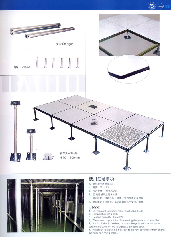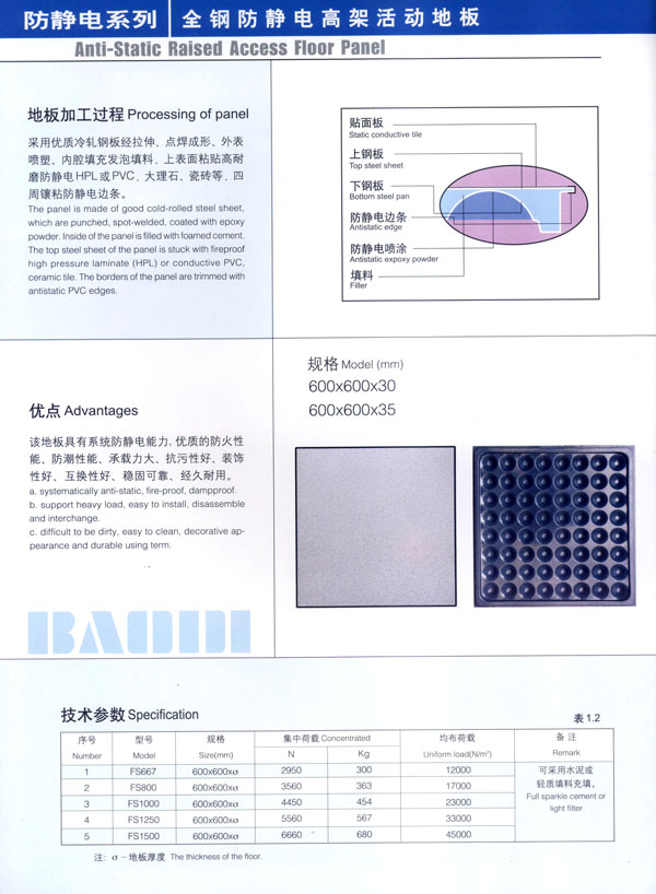 常州市寶進防靜電設(shè)備有限公司是各類防靜電產(chǎn)品開發(fā)、設(shè)計、制造、安裝服務(wù)于一體的企業(yè)。以上海物理學會空間靜電專業(yè)委員會強大的技術(shù)力量為后盾。公司主要致力于各類機房、電氣室設(shè)計、安裝;各類防靜電干擾處理及用戶特種需求。公司擁有防空間靜電干擾—聲學復合系統(tǒng)、輕質(zhì)全鋼活動地板、高環(huán)保型抗靜電貼面等多項發(fā)明專利,是國內(nèi)該行業(yè)中唯一擁有自主知識產(chǎn)權(quán)的企業(yè)。 公司主要產(chǎn)品“寶迪”牌 防靜電高架地板及板材、OA網(wǎng)絡(luò)地板。產(chǎn)品廣泛用于電子廠房、金融系統(tǒng)、電力、廣電、軍隊及智能化樓宇。并向多個國家出口。 針對發(fā)泡水泥填充的全鋼高架地板自身重、承載差的缺點,我們開發(fā)了輕質(zhì)全鋼高架地板。在提前地板承載的同時,大幅減輕了地板的自重。 公司一貫嚴格執(zhí)行ISO9001-2000質(zhì)量保證體系,為用戶提供高品質(zhì)的產(chǎn)品及完善的售后服務(wù)是公司一貫的宗旨。