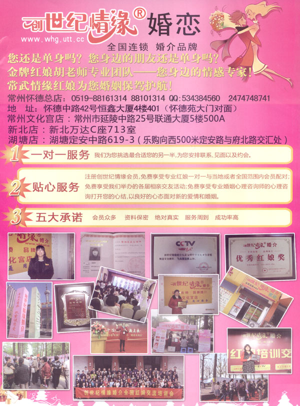 常州創(chuàng)世紀(jì)情緣婚介--是以實(shí)體婚介、活動(dòng)操作、網(wǎng)絡(luò)婚介三大結(jié)合。也是常州最大的國家商務(wù)部特許全國連鎖品牌婚介,并自主創(chuàng)建品牌:常武情緣紅娘婚戀服務(wù)中心。目前是常州地區(qū)實(shí)力最大,口碑最好的婚介品牌連鎖機(jī)構(gòu).本公司曾榮獲江蘇優(yōu)質(zhì)誠信服務(wù)單位,常州市婚姻協(xié)會(huì)婚介理事單位,也是優(yōu)秀會(huì)員單位,也是武進(jìn)區(qū)便民服務(wù)單位,榮獲優(yōu)秀紅娘獎(jiǎng) 金牌紅娘獎(jiǎng),優(yōu)秀門店獎(jiǎng)等榮譽(yù) !冻V萃韴(bào)》 《揚(yáng)子晚報(bào)》,央視,百度,化龍巷等長期合作單位。在工作中我們本著誠實(shí)守信、為會(huì)員保密的準(zhǔn)則。 金牌紅娘胡老師專業(yè)團(tuán)隊(duì)服務(wù)宗旨是:架鵲橋,促良緣,真誠守信,用心溝通 用心服務(wù);我們的工作態(tài)度是:熱情、周到、不卑不亢。 我們的目標(biāo):打造常州婚戀第一中高端品牌,為客戶提供最高效率、最高質(zhì)量的專業(yè)婚戀服務(wù)。我們的優(yōu)勢(shì)是:平臺(tái)大,會(huì)員多,機(jī)會(huì)多,成功率高。一對(duì)一的全程婚戀服務(wù),專業(yè)婚戀情感輔導(dǎo),量身定制征婚方案。電腦海選加人工配對(duì)相結(jié)合的先進(jìn)手段專為忙碌的城市白領(lǐng)省時(shí)高效地成就姻緣。走進(jìn)情緣讓幸福不再遙遠(yuǎn)。常武情緣紅娘為您婚姻保駕護(hù)航.給您百里挑一的機(jī)會(huì),給您幸福一生的情緣”.找對(duì)象就找金牌紅娘胡老師專業(yè)團(tuán)隊(duì)!地址:常州懷德店:懷德中路42號(hào)恒鑫大廈4樓401,(懷德苑北門對(duì)面),電話:0519-88161314,金牌紅娘胡老師:18015073344(微信同步)