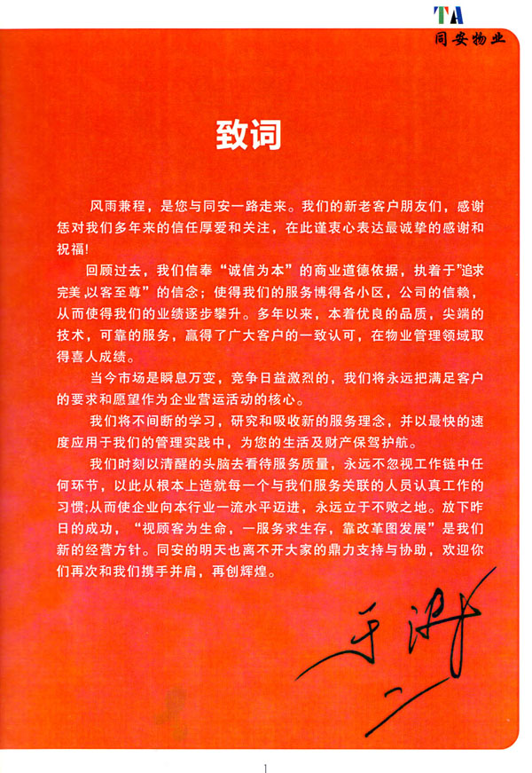 常州市同安物業(yè)管理有限公司注冊(cè)1999年,發(fā)展至今已有多年歷史,本公司坐落于美麗的龍城常州,秉承“融聚無(wú)限未來(lái)”的核心理念,融專業(yè)認(rèn)才,匯優(yōu)質(zhì)資源以”專心,細(xì)心,耐心”的服務(wù)態(tài)度,為客戶打造“安心,順心,稱心”的服務(wù)感受。 公司始終以“打造中國(guó)最值得信賴和最值得尊重的物業(yè)管理服務(wù)集成商”為愿景自我鞭策,不斷前行。同安物業(yè)以客戶滿意為終極目標(biāo),不斷加強(qiáng)”崗位資格認(rèn)證能力,人才招聘與職業(yè)化培訓(xùn)能力,產(chǎn)品策劃與管理設(shè)計(jì)能力,品質(zhì)監(jiān)督與管控能力,技術(shù)更新與運(yùn)營(yíng)優(yōu)化力“五大專業(yè)能力的培養(yǎng)和提升,實(shí)現(xiàn)“精品化管理,專業(yè)化服務(wù)”。 公司發(fā)展至今,員工總數(shù)近千余人,大專以上學(xué)歷200多人,中高級(jí)技術(shù)人員160人,維修人員140人,物業(yè)管理師80名,公司接管面積達(dá)3100000多平方米,設(shè)涉及住宅小區(qū),別墅,大型游樂場(chǎng),公園,醫(yī)院,廠區(qū),商業(yè)等。公司的工作管理逐步導(dǎo)入ISO9001質(zhì)量體系和ISO4001環(huán)境管理體系和GB/T28001職業(yè)健康安全管理體系,嚴(yán)格按照質(zhì)量體系的標(biāo)準(zhǔn)執(zhí)行。