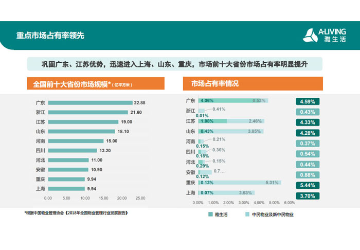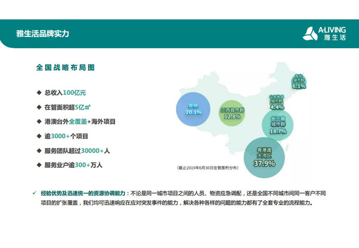 一、立足北上廣,面向全中國(guó),走向全世界 1992年,雅居樂(lè)物業(yè)開(kāi)篇中山,率先引入港式物業(yè)管理模式。1997年,依托雅居樂(lè)地產(chǎn)的崛起,連續(xù)接管中山多個(gè)項(xiàng)目,成為高端大盤(pán)物業(yè)管理的領(lǐng)跑者。1999年,雅居樂(lè)物業(yè)開(kāi)啟專業(yè)化發(fā)展模式,全面通過(guò)英國(guó)皇家BSI的ISO9000質(zhì)量管理體系認(rèn)證,2001年成為國(guó)家首批一級(jí)物業(yè)管理資質(zhì)企業(yè)。 2002年,隨著廣州雅居樂(lè)花園的盛大啟幕,雅居樂(lè)物業(yè)邁開(kāi)向廣州進(jìn)軍的步伐。為尋求更長(zhǎng)遠(yuǎn)的發(fā)展,雅居樂(lè)積極構(gòu)思上市藍(lán)圖,2005年在香港成功上市。在深耕珠三角城市群的同時(shí),2006年雅居樂(lè)物業(yè)揮師北上,正式開(kāi)啟全國(guó)部署戰(zhàn)略。2008年,接管海南清水灣項(xiàng)目,揭開(kāi)旅游地產(chǎn)物業(yè)管理的新篇章。 接下來(lái)近十年里,雅居樂(lè)物業(yè)始終保持著最年輕的成長(zhǎng)姿態(tài),依托“管理數(shù)字化、服務(wù)專業(yè)化、流程標(biāo)準(zhǔn)化和操作機(jī)械化”的發(fā)展戰(zhàn)略,雅居樂(lè)物業(yè)榮膺2018中國(guó)物業(yè)服務(wù)百?gòu)?qiáng)企業(yè)第11名,2018年中國(guó)物業(yè)服務(wù)百?gòu)?qiáng)企業(yè)成長(zhǎng)性第二名、2018年中國(guó)物業(yè)服務(wù)百?gòu)?qiáng)服務(wù)質(zhì)量領(lǐng)先企業(yè)、2018年中國(guó)物業(yè)服務(wù)百?gòu)?qiáng)滿意度領(lǐng)先企業(yè)、2018中國(guó)物業(yè)服務(wù)百?gòu)?qiáng)經(jīng)營(yíng)績(jī)效領(lǐng)先企業(yè)、旅游地產(chǎn)物業(yè)管理領(lǐng)先品牌、2018年中國(guó)辦公物業(yè)管理優(yōu)秀企業(yè)(綠地物業(yè))、2017中國(guó)物業(yè)管理企業(yè)品牌價(jià)值第12名、2017中國(guó)物業(yè)管理企業(yè)綜合實(shí)力第12名、中國(guó)藍(lán)籌物業(yè)企業(yè)、《旅游地產(chǎn)物業(yè)管理服務(wù)標(biāo)準(zhǔn)》(團(tuán)體標(biāo)準(zhǔn))起草工作等多項(xiàng)殊榮。 目前,雅生活集團(tuán)已形成廣州、中山、深圳、南京、上海、西安、成都、海南、云南、北京、鄭州、南寧、沈陽(yáng)、武漢、馬來(lái)西亞十五大城市公司全面發(fā)展的蓬勃態(tài)勢(shì)。截止2017年12月31日,雅生活集團(tuán)管理范圍覆蓋全國(guó)逾69座城市與地區(qū),服務(wù)類型涵蓋主流住宅、高端豪宅、旅游地產(chǎn)、商業(yè)、寫(xiě)字樓等多種業(yè)態(tài),合約總建筑面積為12610萬(wàn)平方米,擁有200多個(gè)項(xiàng)目,服務(wù)業(yè)主逾100萬(wàn)人。 2017年6月,雅生活集團(tuán)收購(gòu)綠地物業(yè)100%股權(quán),并與綠地集團(tuán)簽署戰(zhàn)略合作協(xié)議,8月,綠地集團(tuán)投資10億元獲得雅生活集團(tuán)20%股權(quán)。未來(lái),雅生活集團(tuán)將實(shí)施“雅居樂(lè)物業(yè)”與“綠地物業(yè)”雙品牌驅(qū)動(dòng)戰(zhàn)略,還將尋求在A股上市,力爭(zhēng)打造中國(guó)物業(yè)“A+H”第一股。