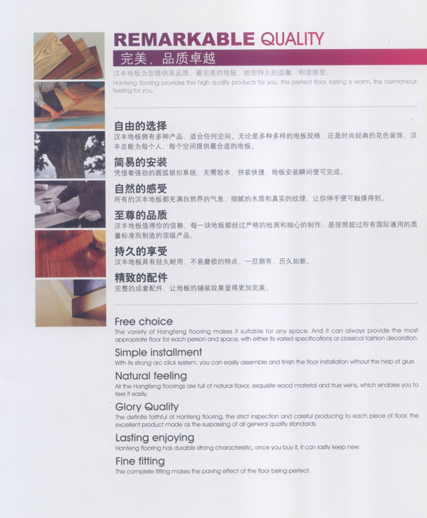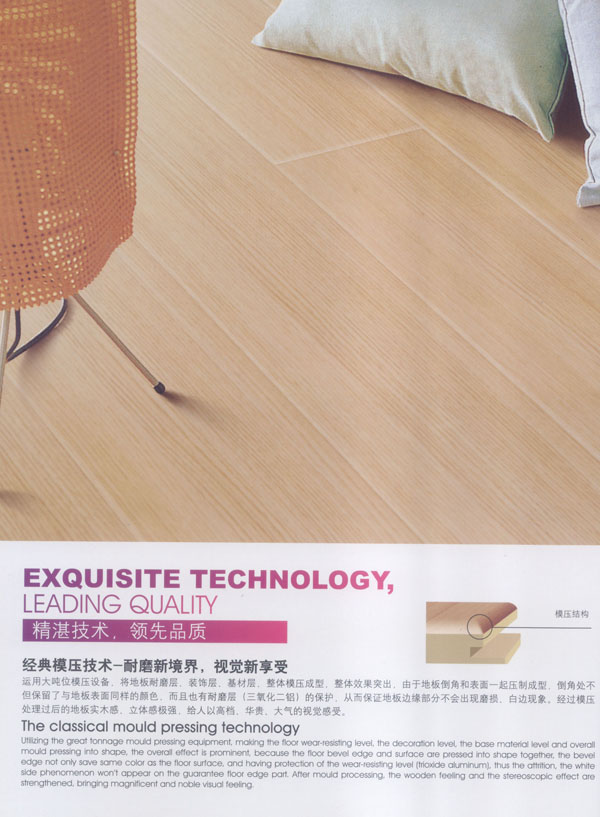 常州漢豐裝飾材料有限公司是一家涉及強化地板制造、屏風鋁材生產(chǎn)、進出口貿(mào)易的大型公司。2001年公司投入重資.全面引進世界頂級一體化自動流水生產(chǎn)線和具有國際先進水準的德國權(quán)威木地板生產(chǎn)技術(shù),興建強化地板生產(chǎn)基地。多年以來.一直不斷加強生產(chǎn)設(shè)備、廠房基礎(chǔ)投入,目前公司年生產(chǎn)強化地板能力已經(jīng)達到了500萬平方米,步入國內(nèi)一流行列,具備了雄厚的國際競爭力。 漢豐地板以奉獻生活中最完美的地板為發(fā)展目標,時尚流行的設(shè)計風格和多樣化的產(chǎn)品類型,贏得了市場的廣泛贊譽和肯定。產(chǎn)品嚴格按照歐洲標準檢測強化木地板的各項性能指標.達到百分百的國際技術(shù)標準,確保了每一塊地板都有著上乘品質(zhì),是綠色環(huán)保的好地板。并先后通過了Isc)9001國際質(zhì)量管理體系認證,IS014001國際環(huán)境管理體系認證.中國環(huán)境標志產(chǎn)品認證,深得用戶的一致好評,是寫字樓、商場、大型超市、學(xué)校、建筑樓宇、娛樂場所、家用私宅等鋪裝的首選地板。