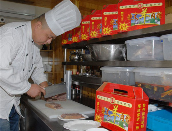 談家的羊肉館位于鄭陸老街上,深秋的一天,記者來到這家羊肉館,穿過大堂走到廚房里,幾名工人正在忙著處理羊肉。余菊華穿著大紅色的薄毛衣,坐在桌子旁,正在麻利地剔著羊肉上的肥油。她是羊肉館的老一代老板娘,如今和老伴談仲興一起,仍天天來店里幫著兒子談旭東打下手。余阿姨隨手拿過一塊長方形的肉皮,用一把小刮刀撳在上面,輕輕地刮著,一團團白白的油被剔了下來,堆在一邊!拔壹业难蛉馀酶蓛舻,腿上的肥肉還有筋筋拉拉的東西,全都要弄掉,就是自己家買了豬肉燒紅燒肉,也不可能弄到這么干凈的,F(xiàn)在的客人都怕胖,所以一定要處理得干干凈凈!庇喟⒁陶f。剔好的肉皮是用來熬成皮凍然后混和著羊肉壓制成羊糕的,只有清理得干凈,沒有一點雜質(zhì),羊糕的質(zhì)量才會好。