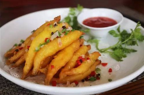 椒鹽大銀魚 從張總口中得知,原來太湖銀魚約有4種,眼前這道菜選用的就是個(gè)頭最大的銀魚,也叫柴魚。只是簡單地裹了面粉下鍋油炸,撒上點(diǎn)自配椒鹽料,酸甜汁作輔。盤中堆成“金色小山”看著美,聞著香,吃著鮮。區(qū)別于上一道菜,對這盤銀魚你大可放開了吃,一口一個(gè),體驗(yàn)脆香表皮中肥美的滋味在口中迸發(fā),絕對是極致的享受。
