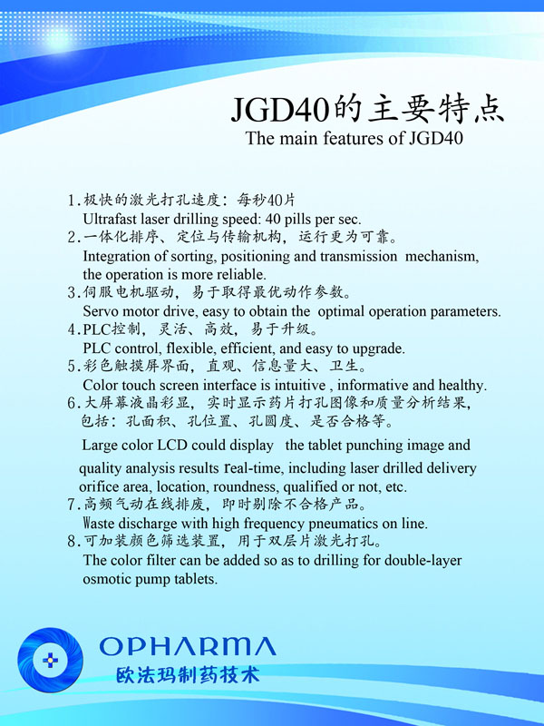 常州歐法瑪制藥技術(shù)有限公司位于長江三角洲黃金腹地——常州。地理位置優(yōu)越、交通便捷,由鐵路、公路、水路、民航形成了一張立體交叉的交通網(wǎng)絡(luò)。 公司創(chuàng)建于2013年,是一家集研發(fā)、生產(chǎn)和銷售為一體,專業(yè)從事高速激光打孔機、滲透泵制劑研發(fā)、生產(chǎn)和銷售。目前公司擁有員工20人,科技研發(fā)和技術(shù)人員占員工總數(shù)80%以上,其中本科以上學歷占80%以上。 公司始建以來,以前瞻的科學規(guī)劃,通過自主研發(fā),解決了高速激光打孔機諸多的世界難題,使之達到40片/秒以上且精確打孔的國際領(lǐng)先水平;同時開發(fā)廢片自動識別、剔除功能,以滿足客戶的實際所需。公司與瑞士等國家研究機構(gòu)的科技合作,以高速激光打孔機為基礎(chǔ),建設(shè)了滲透泵制劑研發(fā)和中試生產(chǎn)車間,開發(fā)了多種藥物的滲透泵制劑,形成了從關(guān)鍵設(shè)備研制,新制劑開發(fā)、工藝配套,到批量生產(chǎn)測試的滲透泵制劑開發(fā)全過程技術(shù)團隊和研究設(shè)施。公司瞄準現(xiàn)代新型釋藥系統(tǒng),吸收國內(nèi)外高端人才,努力開拓控緩釋技術(shù)、靶向給藥技術(shù)及智能給藥技術(shù)。 2013年公司被評為黑馬大賽“創(chuàng)業(yè)組50強”、“領(lǐng)軍人才創(chuàng)業(yè)重點企業(yè)”;2014公司通過了IS09001-2008質(zhì)量管理體系認證、CE認證、江蘇省質(zhì)量信得過企業(yè)。