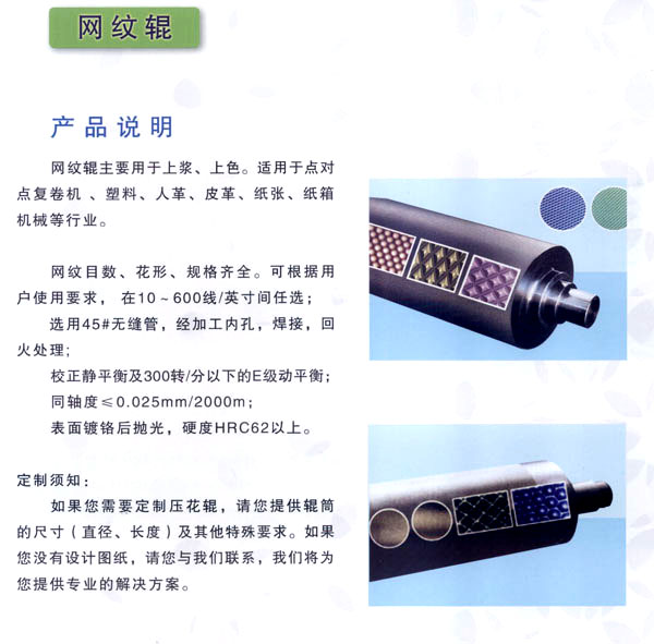 常州市武進區(qū)禮嘉鎮(zhèn)萬超機械有限公司專業(yè)生產(chǎn)、加工花輥、鏡面輥、無紡布設備,及各類機械配件。產(chǎn)品廣泛應用于金屬、塑料、皮革、紙張、玻璃、木材、無紡布、衛(wèi)生材料、包裝裝潢等行業(yè)。 公司經(jīng)營方針:服務鍥而不舍 品質力臻卓越。得到國內(nèi)眾多客戶的厚愛與好評。 歡迎各界朋友蒞臨常州萬超機械有限公司指導和業(yè)務洽談。 萬超為顧客免費打樣、并代客壓紋!