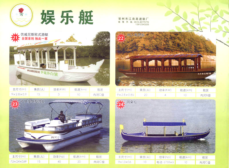 隨著人民生活的提高和水上旅游業(yè)的不斷發(fā)展,原有的游艇已遠不能滿足人民群眾不斷提高的需求。為適應(yīng)水上旅游業(yè)市場的變 化,我廠開發(fā)研制了符合中國國情、具有民族特色的仿古畫舫游艇及國際最新流行款式一城市旅游休閑觀光艇。特別近兩年又開發(fā)了一批精品畫舫船投放市場之后深受景區(qū)的歡迎。今年我廠又開發(fā)了適用少數(shù)民族的“風(fēng)雨橋”、“寨門”畫舫艇。在湖南、廣西、云南、貴州深受愛戴。此艇別具風(fēng)格,民族風(fēng)情特別濃厚。侗鄉(xiāng)一號計劃在2006年5月1日投放在貴州黎平侗鄉(xiāng)風(fēng)景區(qū)八舟河景區(qū)使有(風(fēng)序號)。我廠歡迎用戶來圖加工,來廠考察訂貨,畫舫艇款式多多,終有一款適合你。歡迎來電來函垂詢。索樣即寄。誠心銷售、人情化服務(wù)、企業(yè)文化、精品畫舫。