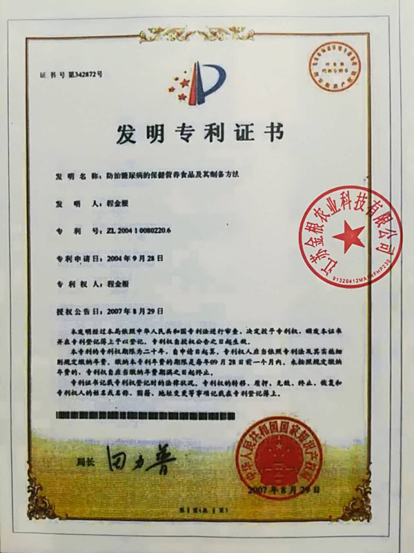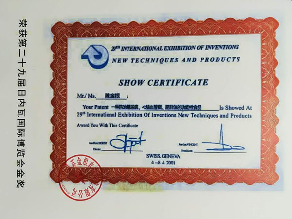 本產(chǎn)品原料是在高寒、高濕、旱地等種植,要求施農(nóng)家肥,采用生物治蟲,因此是無公害的優(yōu)良品種。目前公司有四個(gè)種植基地,分別在江西、江蘇、陜西等地。 一種防治糖尿病功能性食品專利號(hào):ZL99119217.6。 “程金根”系列產(chǎn)品先后獲得二項(xiàng)發(fā)明專利,并經(jīng)聯(lián)合國科技成果評(píng)估論證為A級(jí)產(chǎn)品,屬世界領(lǐng)先技術(shù)。在韓國、美國、香港、德國分別榮獲新技術(shù)、新產(chǎn)品博覽會(huì)金獎(jiǎng)。