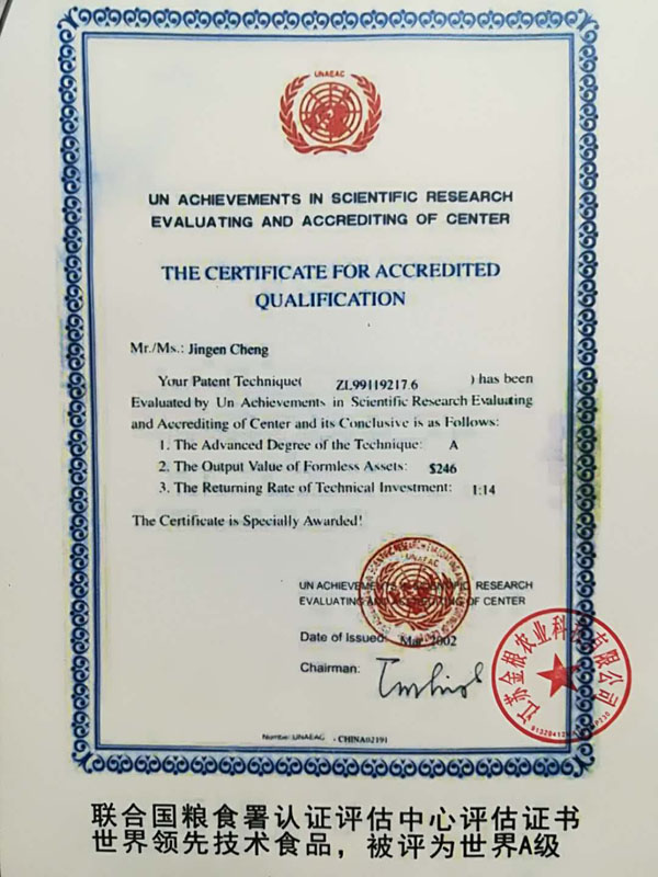 2006年經(jīng)國家農(nóng)業(yè)部、發(fā)展改革委員會(huì)、聯(lián)合國糧農(nóng)組織代表、中醫(yī)研究院、中國科學(xué)技術(shù)協(xié)會(huì)、中醫(yī)藥大學(xué)、農(nóng)業(yè)大學(xué)、農(nóng)學(xué)院、中國保健協(xié)會(huì)、糧油協(xié)會(huì)、食品研究所等十幾位專家對(duì)該專利產(chǎn)品做了評(píng)估論證,一致認(rèn)為該項(xiàng)技術(shù)先進(jìn)產(chǎn)品突出、食用安全,并給予很高的評(píng)價(jià)。 論證意見: 1、這項(xiàng)專利技術(shù)填補(bǔ)了國內(nèi)糖尿病特種功效食品的專用品種和栽培技術(shù)空白。 2、采用有機(jī)食品技術(shù),并以有機(jī)農(nóng)產(chǎn)品為原料加工特種營養(yǎng)食品,提高了產(chǎn)品的安全性。 3、用鉻、硒、鋅、鎂、鋰生物強(qiáng)化栽培技術(shù)已獲得發(fā)明專利,為國際先進(jìn)水平。 4、經(jīng)過10多年的應(yīng)用實(shí)踐,進(jìn)一步證明了通過飲食調(diào)理,可預(yù)防糖尿病,對(duì)已患糖尿病者有緩解和預(yù)防糖尿病綜合癥的功效。