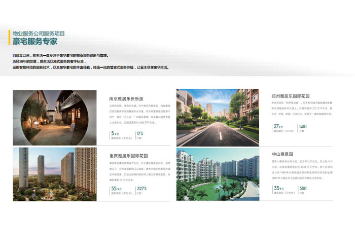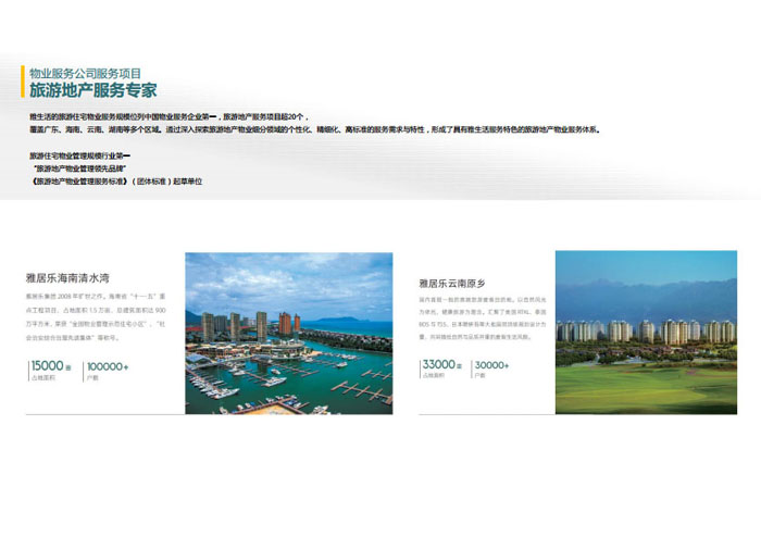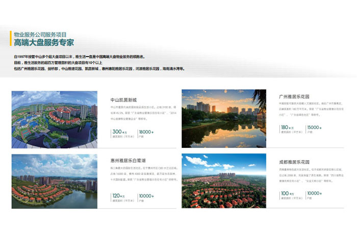 一、立足北上廣,面向全中國,走向全世界 1992年,雅居樂物業(yè)開篇中山,率先引入港式物業(yè)管理模式。1997年,依托雅居樂地產(chǎn)的崛起,連續(xù)接管中山多個項目,成為高端大盤物業(yè)管理的領(lǐng)跑者。1999年,雅居樂物業(yè)開啟專業(yè)化發(fā)展模式,全面通過英國皇家BSI的ISO9000質(zhì)量管理體系認(rèn)證,2001年成為國家首批一級物業(yè)管理資質(zhì)企業(yè)。 2002年,隨著廣州雅居樂花園的盛大啟幕,雅居樂物業(yè)邁開向廣州進(jìn)軍的步伐。為尋求更長遠(yuǎn)的發(fā)展,雅居樂積極構(gòu)思上市藍(lán)圖,2005年在香港成功上市。在深耕珠三角城市群的同時,2006年雅居樂物業(yè)揮師北上,正式開啟全國部署戰(zhàn)略。2008年,接管海南清水灣項目,揭開旅游地產(chǎn)物業(yè)管理的新篇章。 接下來近十年里,雅居樂物業(yè)始終保持著最年輕的成長姿態(tài),依托“管理數(shù)字化、服務(wù)專業(yè)化、流程標(biāo)準(zhǔn)化和操作機(jī)械化”的發(fā)展戰(zhàn)略,雅居樂物業(yè)榮膺2018中國物業(yè)服務(wù)百強(qiáng)企業(yè)第11名,2018年中國物業(yè)服務(wù)百強(qiáng)企業(yè)成長性第二名、2018年中國物業(yè)服務(wù)百強(qiáng)服務(wù)質(zhì)量領(lǐng)先企業(yè)、2018年中國物業(yè)服務(wù)百強(qiáng)滿意度領(lǐng)先企業(yè)、2018中國物業(yè)服務(wù)百強(qiáng)經(jīng)營績效領(lǐng)先企業(yè)、旅游地產(chǎn)物業(yè)管理領(lǐng)先品牌、2018年中國辦公物業(yè)管理優(yōu)秀企業(yè)(綠地物業(yè))、2017中國物業(yè)管理企業(yè)品牌價值第12名、2017中國物業(yè)管理企業(yè)綜合實力第12名、中國藍(lán)籌物業(yè)企業(yè)、《旅游地產(chǎn)物業(yè)管理服務(wù)標(biāo)準(zhǔn)》(團(tuán)體標(biāo)準(zhǔn))起草工作等多項殊榮。 目前,雅生活集團(tuán)已形成廣州、中山、深圳、南京、上海、西安、成都、海南、云南、北京、鄭州、南寧、沈陽、武漢、馬來西亞十五大城市公司全面發(fā)展的蓬勃態(tài)勢。截止2017年12月31日,雅生活集團(tuán)管理范圍覆蓋全國逾69座城市與地區(qū),服務(wù)類型涵蓋主流住宅、高端豪宅、旅游地產(chǎn)、商業(yè)、寫字樓等多種業(yè)態(tài),合約總建筑面積為12610萬平方米,擁有200多個項目,服務(wù)業(yè)主逾100萬人。 2017年6月,雅生活集團(tuán)收購綠地物業(yè)100%股權(quán),并與綠地集團(tuán)簽署戰(zhàn)略合作協(xié)議,8月,綠地集團(tuán)投資10億元獲得雅生活集團(tuán)20%股權(quán)。未來,雅生活集團(tuán)將實施“雅居樂物業(yè)”與“綠地物業(yè)”雙品牌驅(qū)動戰(zhàn)略,還將尋求在A股上市,力爭打造中國物業(yè)“A+H”第一股。