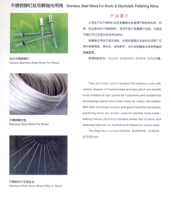 公司專業(yè)生產(chǎn)各種不銹鋼線材,年生產(chǎn)能力25000噸,產(chǎn)品已廣泛用于醫(yī)療、交通化工、彈簧、陶瓷模具、鋼球、五金件、標(biāo)準(zhǔn)件、精密軸制造等各領(lǐng)域。