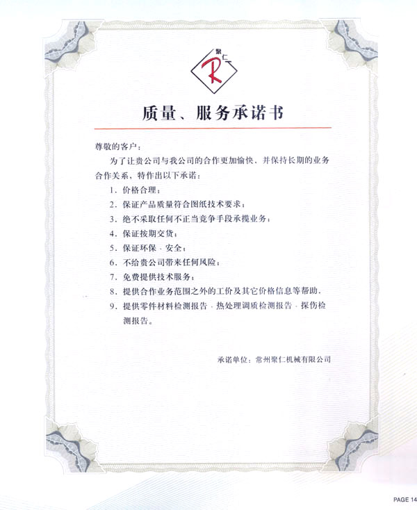 聚仁重效率更重質(zhì)量;在聚仁,寧缺毋濫的精品意識是每個員工的責(zé)任,制造精良產(chǎn)品是每個員工永遠(yuǎn)的追求。聚仁立求做到要效率,更要質(zhì)量,除了品質(zhì)一流的產(chǎn)品外,其它產(chǎn)品絕不交付客戶。聚仁重現(xiàn)場更重市場:市場決定現(xiàn)場,現(xiàn)場連著市場,現(xiàn)場為市場服務(wù),在搞好現(xiàn)場管理的同時,實(shí)現(xiàn)與市場和客戶的雙贏。聚仁對客戶的承諾是:不合格的材料不進(jìn)廠,不合格的半成品不轉(zhuǎn)序,不合格的產(chǎn)品不交付,以百分之百的合格品交付客戶。