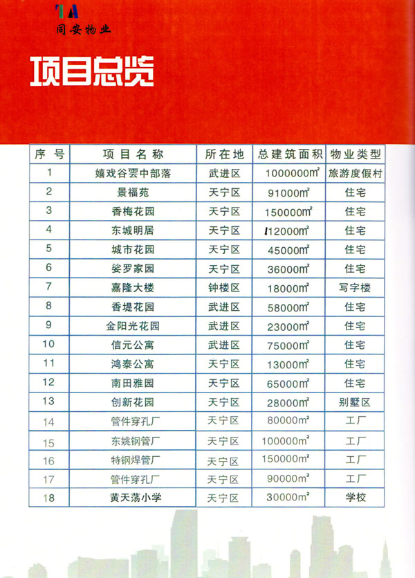 常州市同安物業(yè)管理有限公司注冊1999年,發(fā)展至今已有多年歷史,本公司坐落于美麗的龍城常州,秉承“融聚無限未來”的核心理念,融專業(yè)認才,匯優(yōu)質資源以”專心,細心,耐心”的服務態(tài)度,為客戶打造“安心,順心,稱心”的服務感受。 公司始終以“打造中國最值得信賴和最值得尊重的物業(yè)管理服務集成商”為愿景自我鞭策,不斷前行。同安物業(yè)以客戶滿意為終極目標,不斷加強”崗位資格認證能力,人才招聘與職業(yè)化培訓能力,產品策劃與管理設計能力,品質監(jiān)督與管控能力,技術更新與運營優(yōu)化力“五大專業(yè)能力的培養(yǎng)和提升,實現“精品化管理,專業(yè)化服務”。 公司發(fā)展至今,員工總數近千余人,大專以上學歷200多人,中高級技術人員160人,維修人員140人,物業(yè)管理師80名,公司接管面積達3100000多平方米,設涉及住宅小區(qū),別墅,大型游樂場,公園,醫(yī)院,廠區(qū),商業(yè)等。公司的工作管理逐步導入ISO9001質量體系和ISO4001環(huán)境管理體系和GB/T28001職業(yè)健康安全管理體系,嚴格按照質量體系的標準執(zhí)行。