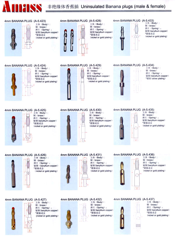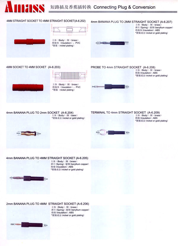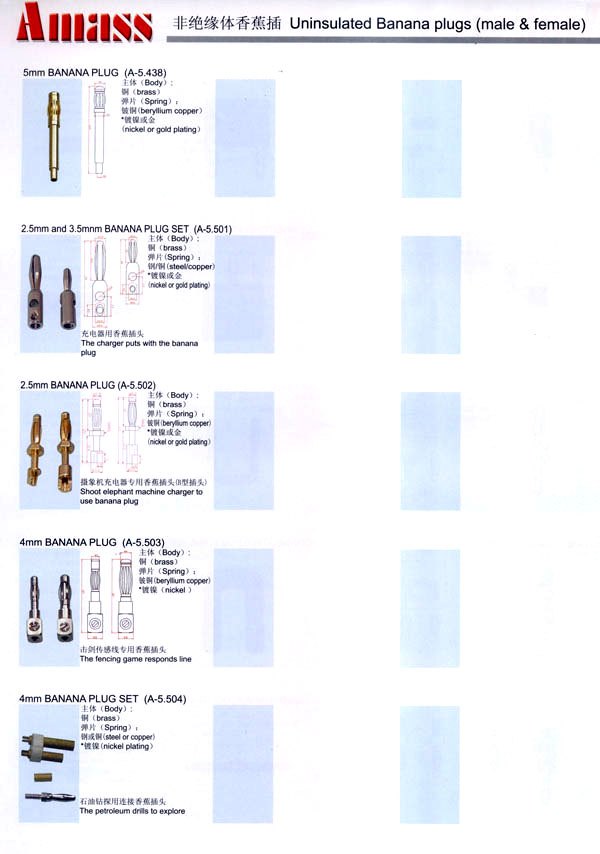 本公司專業(yè)生產(chǎn)各類香蕉插頭,香蕉插座,接線柱,電瓶夾,鱷魚夾,測試導(dǎo)線,測試筆等。產(chǎn)品分2mm/2.5mm/3mm/3.5mm/4mm五大系列,百余種款式, 各種香蕉插廣泛用于儀器、儀表、電力測試、教學(xué)、玩具,視聽設(shè)備、醫(yī)療儀器,保健產(chǎn)品等領(lǐng)域。公司技術(shù)力量雄厚,生產(chǎn)工藝先進(jìn),產(chǎn)品遠(yuǎn)銷港、臺(tái)、歐美,并與飛利浦等國際品牌配套。公司本著精益求精的理念,歡迎新老客戶光臨。 我們擁有資深的工程師和豐富的電子產(chǎn)品銷售經(jīng)驗(yàn),專業(yè)生產(chǎn)各類電子接插件產(chǎn)品。 香蕉插頭,香蕉插座,電瓶夾,鱷魚夾等品種齊全、 質(zhì)量可靠,致力服務(wù)于通訊、數(shù)據(jù)通信、消費(fèi)類電子產(chǎn)品、計(jì)算機(jī)和計(jì)算機(jī)外圍設(shè)備以及工業(yè)應(yīng)用等領(lǐng)域,能給客戶提供全面采購解決方案。 我們秉承穩(wěn)健作風(fēng)、誠實(shí)經(jīng)營、合理價(jià)格、完善服務(wù)的宗旨,在全體客戶的支持下,公司不斷創(chuàng)新進(jìn)取,業(yè)績蒸蒸日上,已與數(shù)十家電子零件制造商及其分支機(jī)構(gòu)建立密切合作關(guān)系,在國內(nèi)擁有數(shù)百家固定客戶。