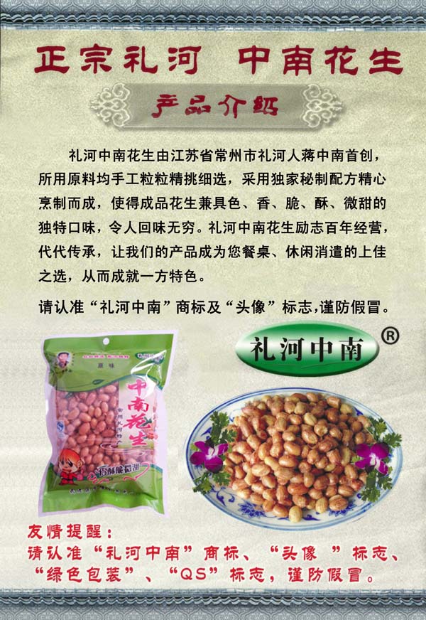 武進(jìn)區(qū)牛塘中南食品廠的是由原“禮河中南”花生發(fā)展而成。"禮河中南"花生由常州禮河人蔣中南首創(chuàng)。所采用的花生,選用優(yōu)質(zhì)的產(chǎn)地,經(jīng)過(guò)人工精心挑選,把不規(guī)則的粒子去掉,加上獨(dú)家的配方和精工制作,使花生香、酥、脆、微甜。獨(dú)特的口味,令人吃了回味無(wú)窮,在常武地區(qū)享有盛譽(yù)、暢銷不衰。 隨著“禮河中南“花生在常武地區(qū)的暢銷,企業(yè)不斷的發(fā)展壯大,逐漸發(fā)展成為一個(gè)專業(yè)生產(chǎn)加工油炸花生的公司,擁有完整、科學(xué)的質(zhì)量管理體系。武進(jìn)牛塘中南花生食品廠設(shè)備齊全、環(huán)境干凈整潔、資質(zhì)齊全,企業(yè)的誠(chéng)信、實(shí)力和產(chǎn)品質(zhì)量獲得業(yè)界的認(rèn)可。 正宗的中南花生為綠色包裝,包裝上有“禮河中南”花生創(chuàng)始人蔣中南先生的頭像以及QS生產(chǎn)許可標(biāo)志,請(qǐng)廣大客戶認(rèn)準(zhǔn)購(gòu)買,以防假冒。 歡迎各界朋友蒞臨參觀、指導(dǎo)和業(yè)務(wù)洽談。 制造商:常州市武進(jìn)區(qū)牛塘中南食品廠 銷售店:常州市武進(jìn)區(qū)禮河聚新家園商業(yè)街12-8號(hào) 常州市武進(jìn)區(qū)湖塘鎮(zhèn)東方路53號(hào)(陸家橋西側(cè))