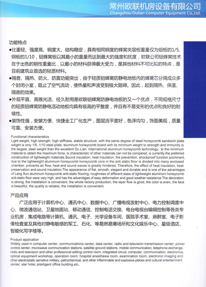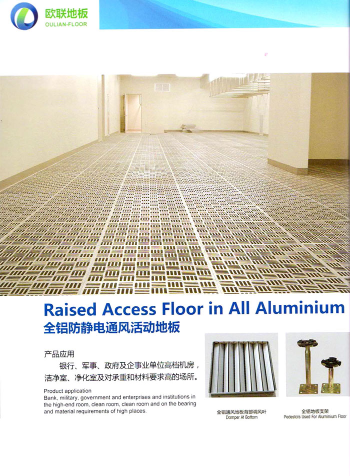 防靜電高架活動(dòng)地板、全鋼地板、陶瓷地板是計(jì)算機(jī)行業(yè)發(fā)展起來(lái)的新型鋪地材料,隔離了潮氣、靜電灰塵,最重要的是解決了綜合布線問(wèn)題,無(wú)需預(yù)埋管線,可隨時(shí)拆卸、搬移,保證了資訊設(shè)備完整的優(yōu)點(diǎn),適應(yīng)了智能化樓宇中信息自動(dòng)化技術(shù)對(duì)所處環(huán)境的特定要求,避免了廣大客戶的雙重投資,使現(xiàn)代化辦公程度更加高效,辦公場(chǎng)所更加舒適。 “歐聯(lián)”系列全鋼地板,符合國(guó)家安全要求,種類完備多樣,其中防靜電陶瓷地板、硫酸鈣地板等除具有普通瓷質(zhì)的裝飾和實(shí)用性外,其耐磨、防水、防火功能優(yōu)于其它同類產(chǎn)品,防靜電系列地板,能切合不同客戶的要求,其靈活的配置,深受客戶歡迎,不同材質(zhì)的地板結(jié)構(gòu)使設(shè)計(jì)師的設(shè)計(jì)空間比傳統(tǒng)的更加廣闊自由和善變。 公司大力發(fā)展國(guó)內(nèi)外銷售業(yè)務(wù),多次中標(biāo)國(guó)內(nèi)重點(diǎn)工程 ,例:哈爾濱醫(yī)科大學(xué)、山東大學(xué)、上海普通機(jī)場(chǎng)等。 公司將一如既往開(kāi)發(fā)和制造一流的產(chǎn)品,愿與廣大有識(shí)之士合作發(fā)展,共創(chuàng)美好未來(lái)。