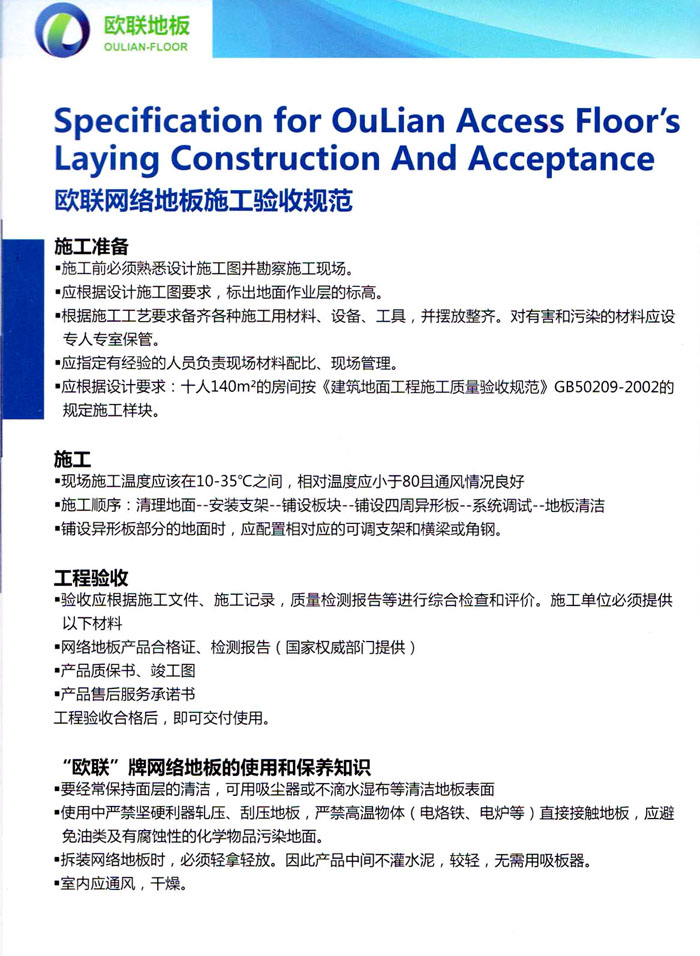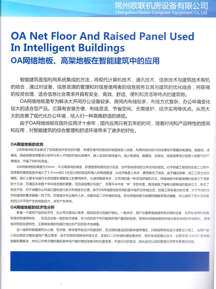 防靜電高架活動地板、全鋼地板、陶瓷地板是計(jì)算機(jī)行業(yè)發(fā)展起來的新型鋪地材料,隔離了潮氣、靜電灰塵,最重要的是解決了綜合布線問題,無需預(yù)埋管線,可隨時(shí)拆卸、搬移,保證了資訊設(shè)備完整的優(yōu)點(diǎn),適應(yīng)了智能化樓宇中信息自動化技術(shù)對所處環(huán)境的特定要求,避免了廣大客戶的雙重投資,使現(xiàn)代化辦公程度更加高效,辦公場所更加舒適。 “歐聯(lián)”系列全鋼地板,符合國家安全要求,種類完備多樣,其中防靜電陶瓷地板、硫酸鈣地板等除具有普通瓷質(zhì)的裝飾和實(shí)用性外,其耐磨、防水、防火功能優(yōu)于其它同類產(chǎn)品,防靜電系列地板,能切合不同客戶的要求,其靈活的配置,深受客戶歡迎,不同材質(zhì)的地板結(jié)構(gòu)使設(shè)計(jì)師的設(shè)計(jì)空間比傳統(tǒng)的更加廣闊自由和善變。 公司大力發(fā)展國內(nèi)外銷售業(yè)務(wù),多次中標(biāo)國內(nèi)重點(diǎn)工程 ,例:哈爾濱醫(yī)科大學(xué)、山東大學(xué)、上海普通機(jī)場等。 公司將一如既往開發(fā)和制造一流的產(chǎn)品,愿與廣大有識之士合作發(fā)展,共創(chuàng)美好未來。