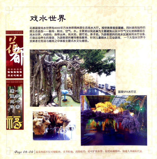 淹城花都溫泉水城孕育天地之精華,悅身、悅?cè)、悅心、悅神。置身其中泉水潺潺,霧氣繚繞、花瓣飄香,恍若仙境。“掬水月在手,弄花香滿衣”,花都溫泉的浪漫與溫潤在這里完美展現(xiàn)。 花都溫泉水城包括洗浴區(qū)、戲水世界、露天溫泉、自助餐廳、生態(tài)房、別墅區(qū)、紅文化房、VIP區(qū)等多種功能區(qū)域,是集溫泉養(yǎng)生、休閑住宿、演藝會務(wù)為—體的休閑度假勝地,給賓客帶來江南小鎮(zhèn)的浪漫水城之旅。 古木新枝畔賓客對酒當(dāng)歌,溪泉石椅旁把茶品啜。 淹城-三勤生態(tài)酒店,這里是一處綠色生態(tài)的美食家園。此地鬼斧神工.奇水異石,和風(fēng)細(xì)雨林中穿過,引百鳥朝來暮歌;這里集生態(tài)餐飲、演藝、中小型會務(wù)為一體,將現(xiàn)代裝飾風(fēng)格和古雅拙樸的自然裝修完美整合;這里聚集大江南北名廚,推出精致綠色美昧佳肴。來到這里,賓客可享田園至美之景,品舌尖至鮮之味,實(shí)乃人生一大樂事。